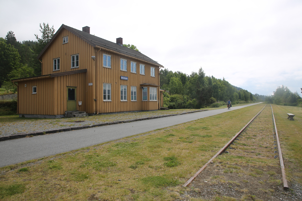 Along the edge of Mjosa we travelled utilising a railway path superseded by modern line that criss crossed the path. Lovely views to the hills across the lake to the left. Halfway along past the abandoned station the path turned to hard packed gravel that slowed us little.