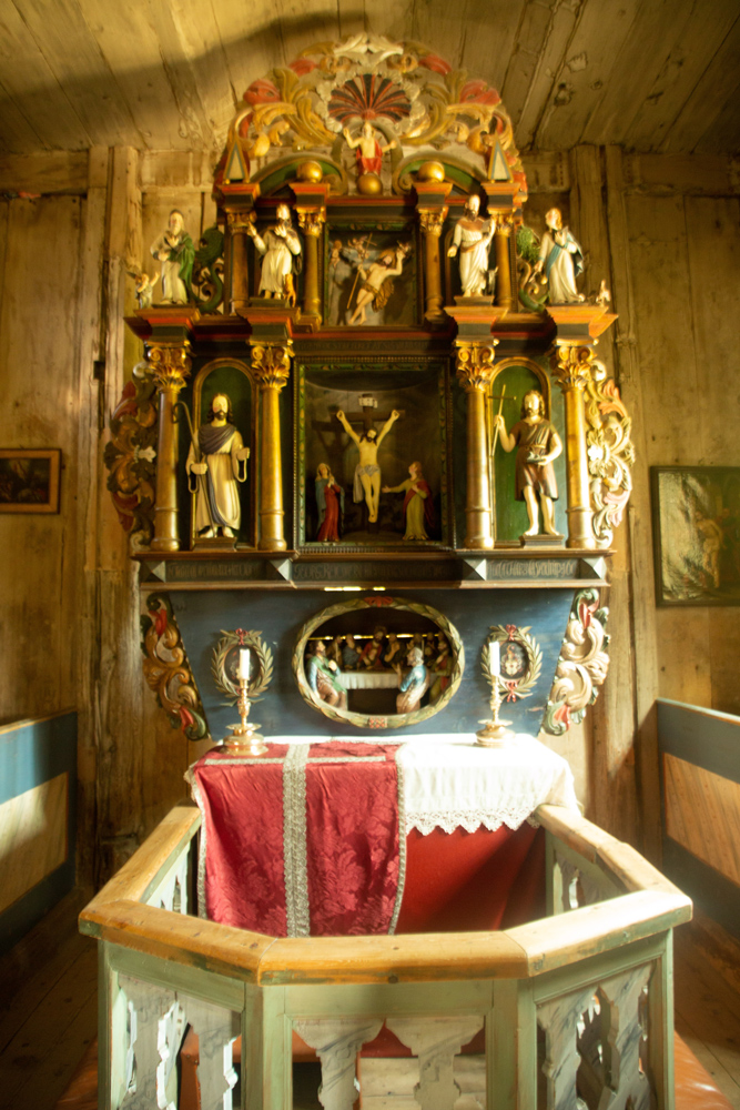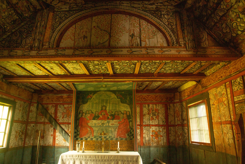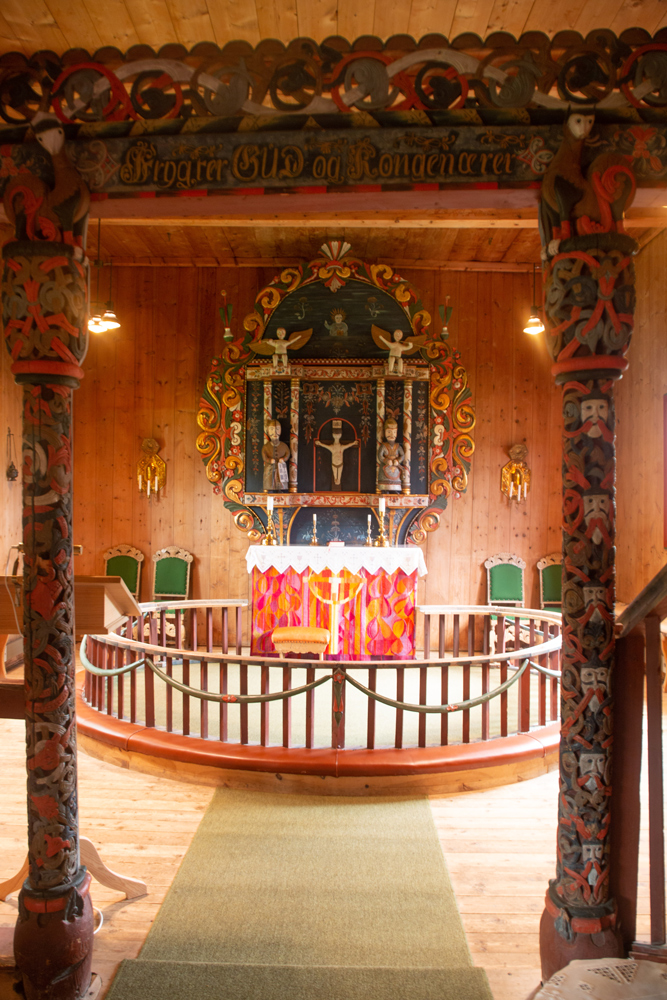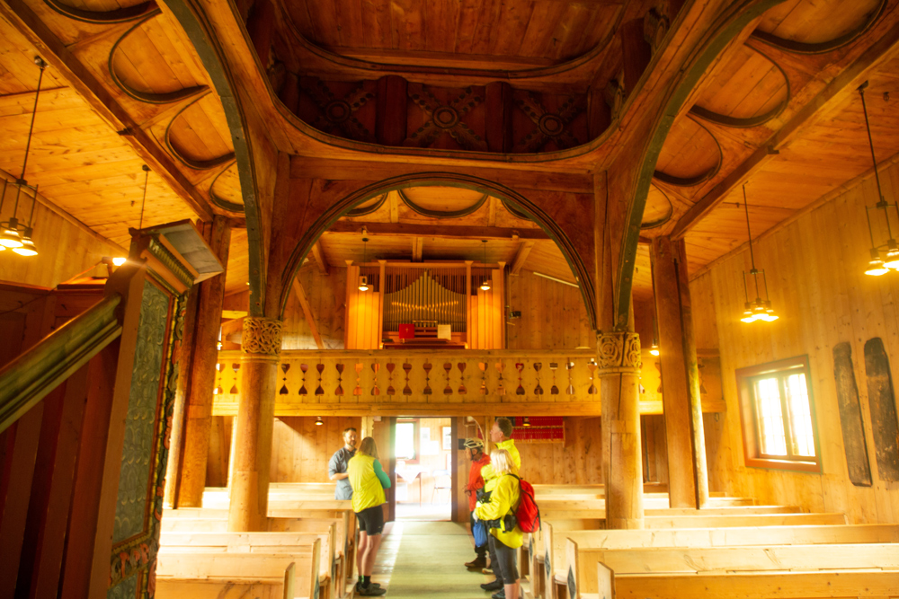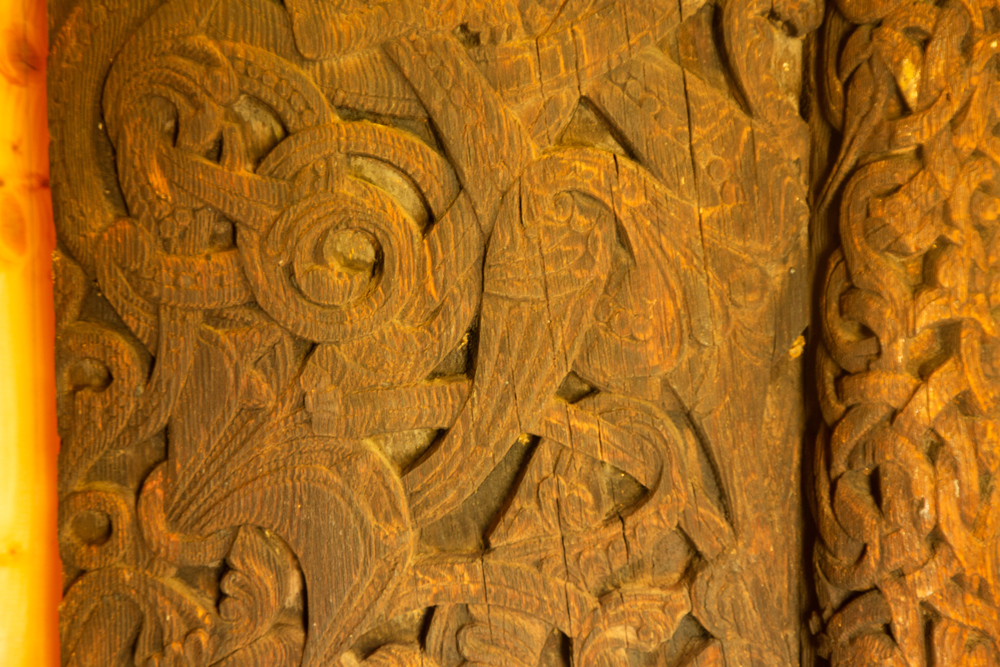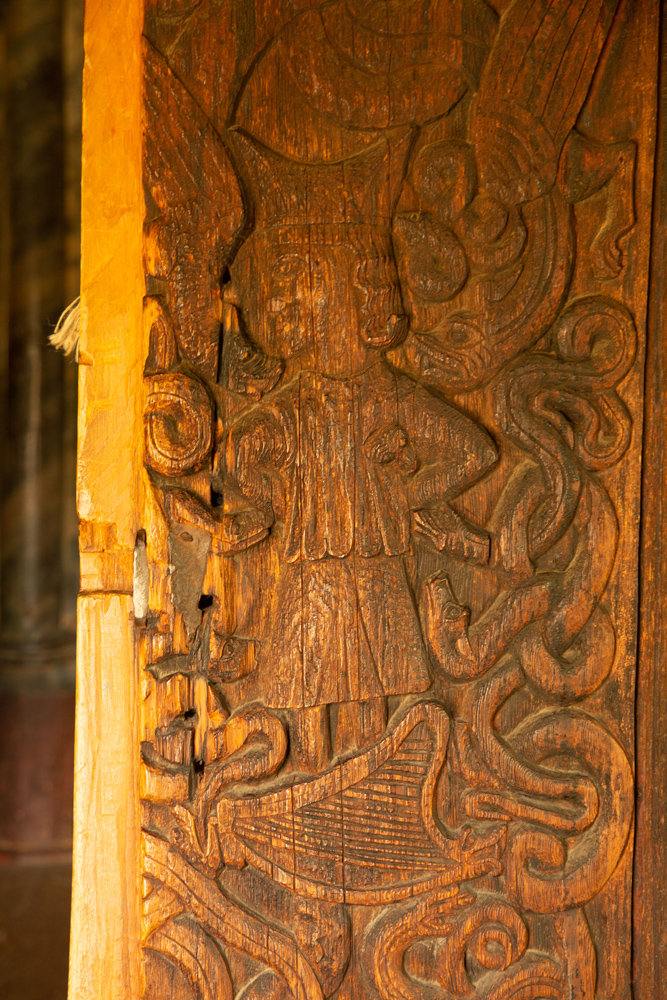 The cloud that had been chancing us finally caught up but Hore Stave church needed visiting. Built in the 12th century, the original church had been expanded and you could see the cuts in the ancient slow growing pine where the walls had been removed. A guide took us through all sorts of parts. The original tower was now the entrance structure. Two dragons entwined in the frontal original door and the alter was carved by a local in the 18th century.