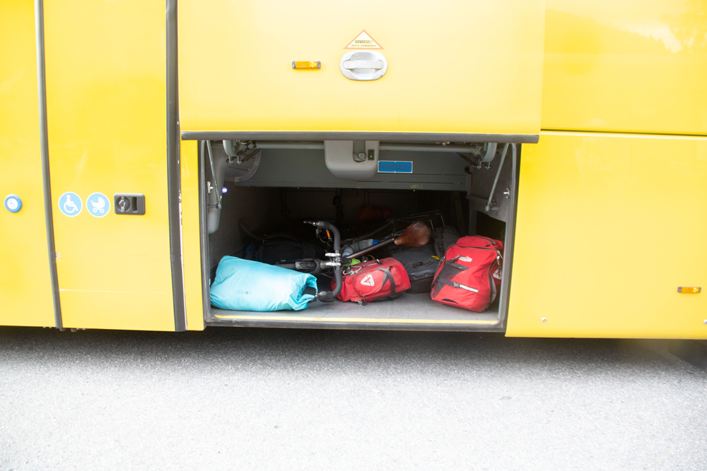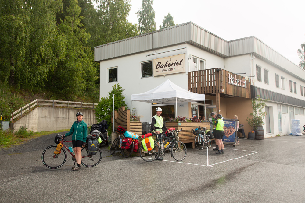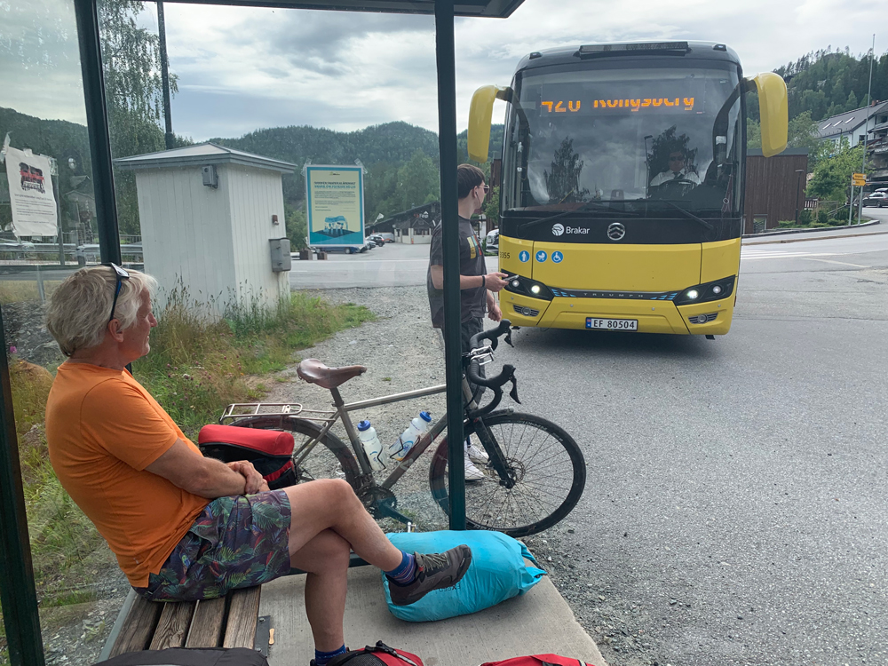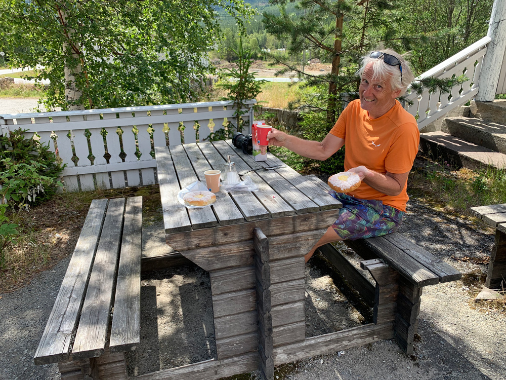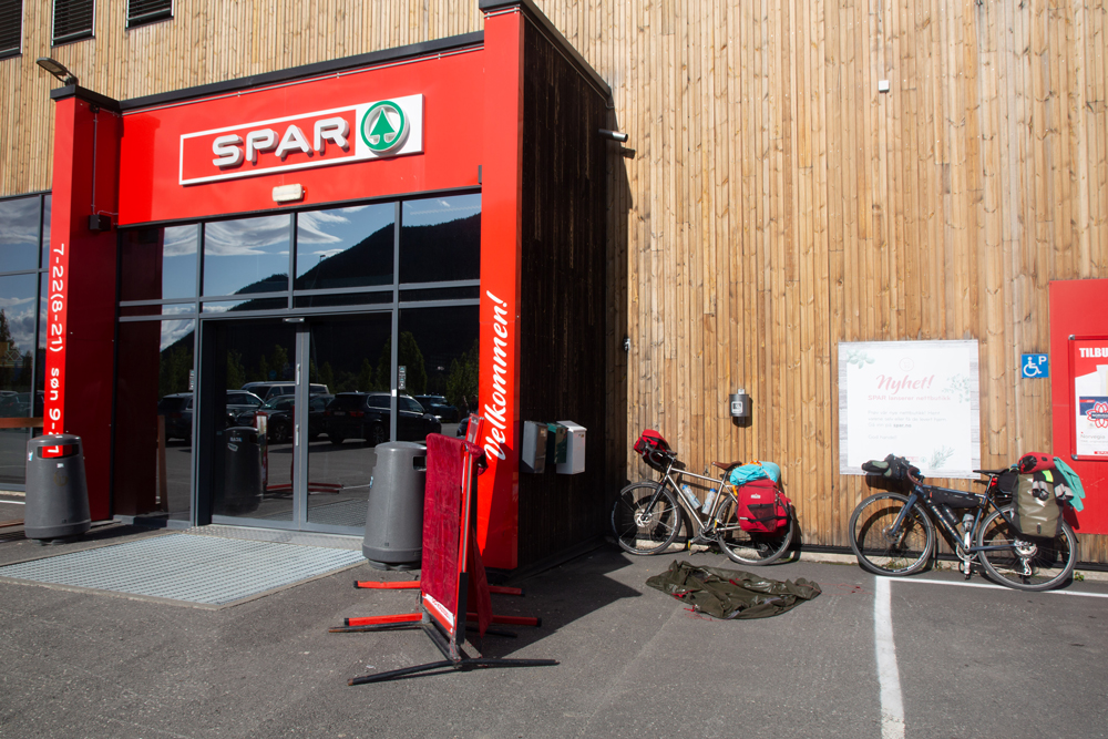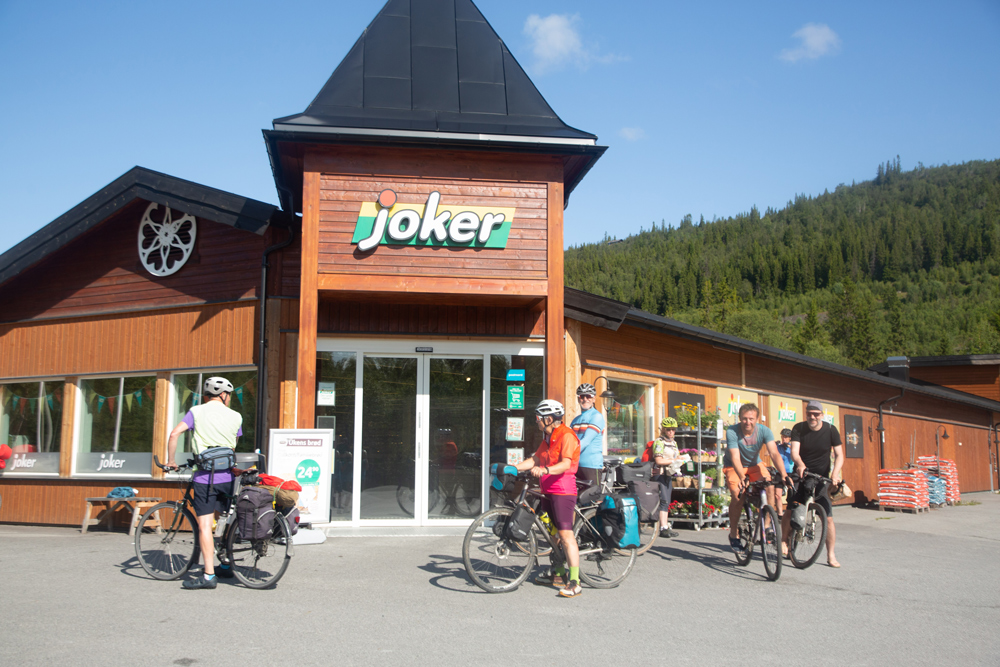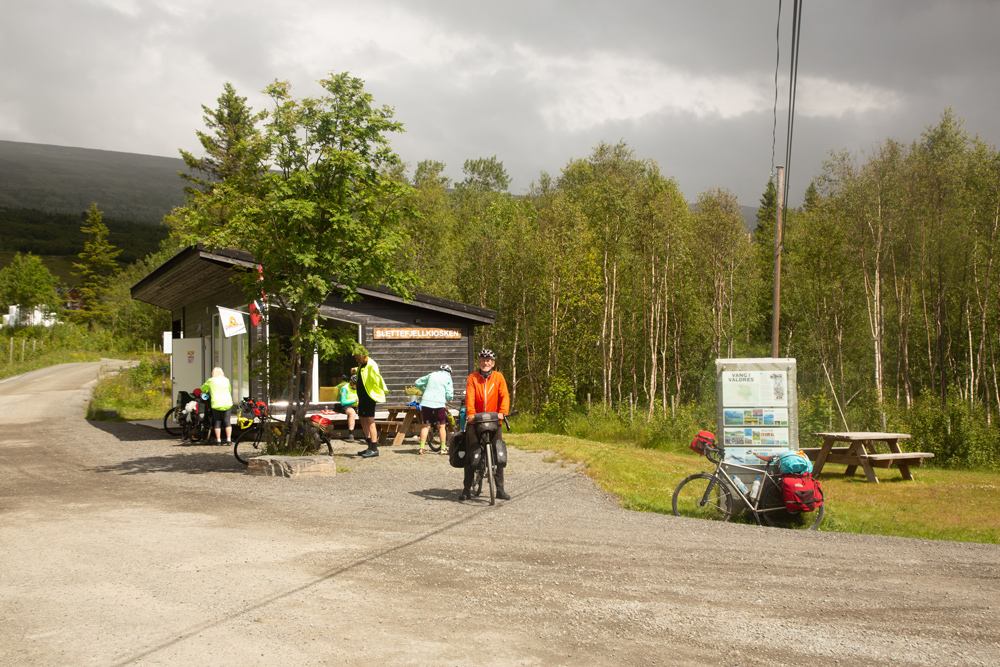 Siobhan’s bus south went twice a day, so by 09:30, I had transported her panniers to the joker, returned packed and with everyone lose waited to wave her off. Sure enough the big yellow electric bus opened its luggage door to swallow the bike and luggage taking her to Veggli for the night. For the rest of us, it was pedal power, but not before trying to construct dinner from a small store. Simon as ever came to the rescue, stripped of tuna the previous night, we bought tomato paste, onions, mushrooms, spices and pasta just in case, with a sprinkling of herbs from various panniers that should suffice.