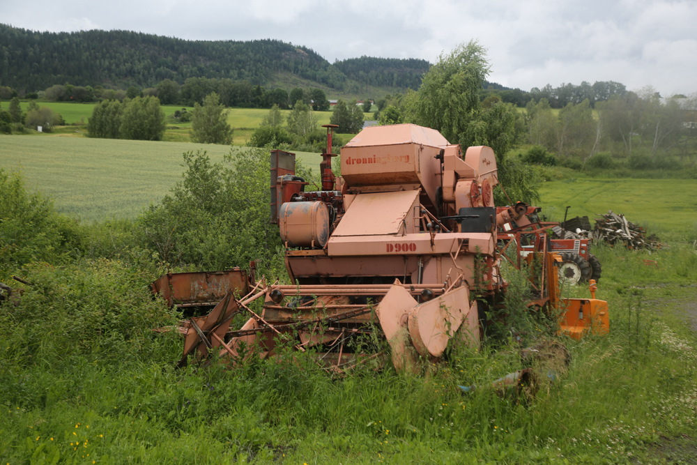 Leaving the campsite, we took the main route 40 for a kilometre. Turning right opposite the railway bridge we started on the parallel minor road with tractors and the occasional car for company. After 3 miles we passed another Stave Church, this one locked but a beautiful painting of two men bearing grapes. The rest of the road to Kongsberg was an absolute delight. Undulating in places, passing fields and through woodland, hardly any traffic, a real joy. The woodlands looked natural, a floor canopy of yellow flowers and pine trees at irregular places rather than the lines that we have in the UK.