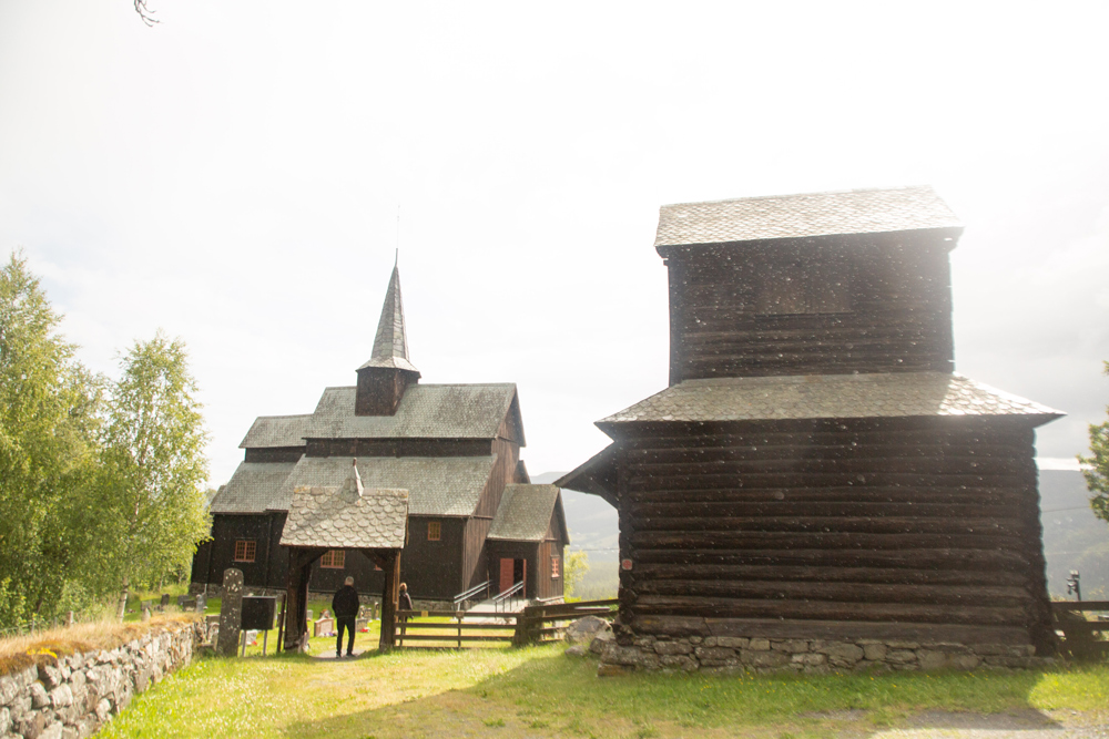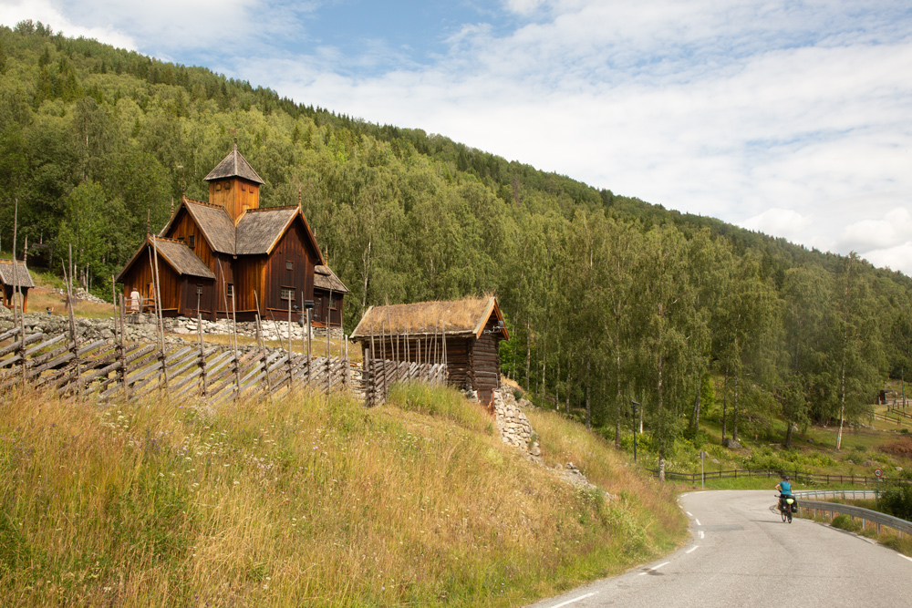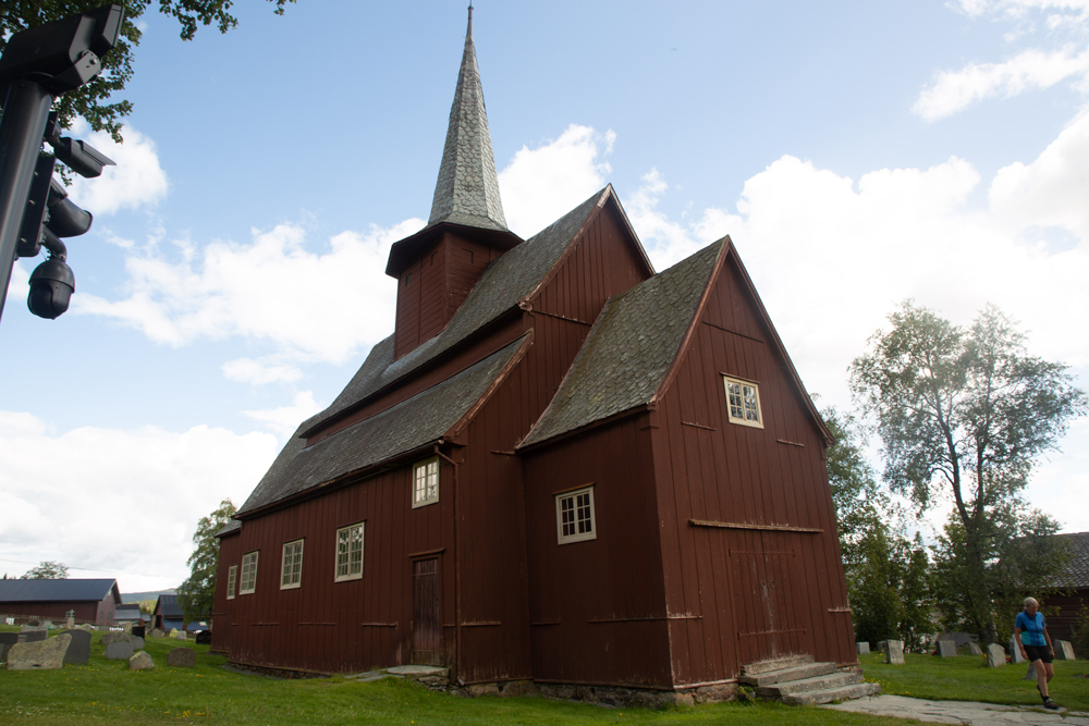 4km later a sign pointed left, Uvdal stave church 1km, it was tempting but uphill. I started, Sharon followed not at convinced it was worth the effort. Eventually the church appeared above us, it looked kinda small, but we were here now. What we had tripped over was an amazing place, a stave church with a guide and the Norwegian favourite, yes a smattering of houses moved from the area.