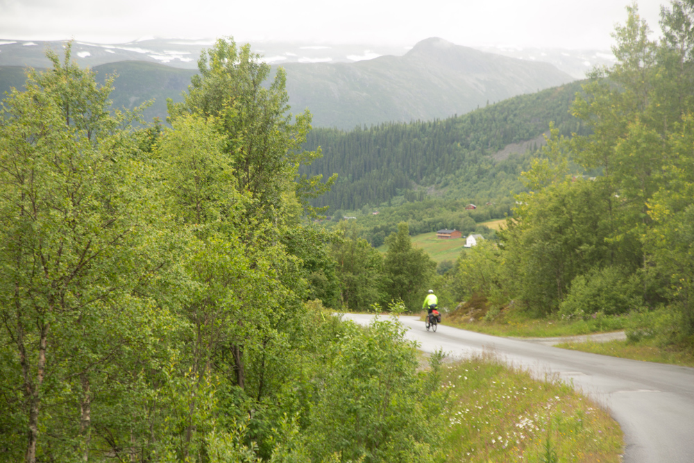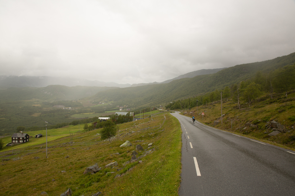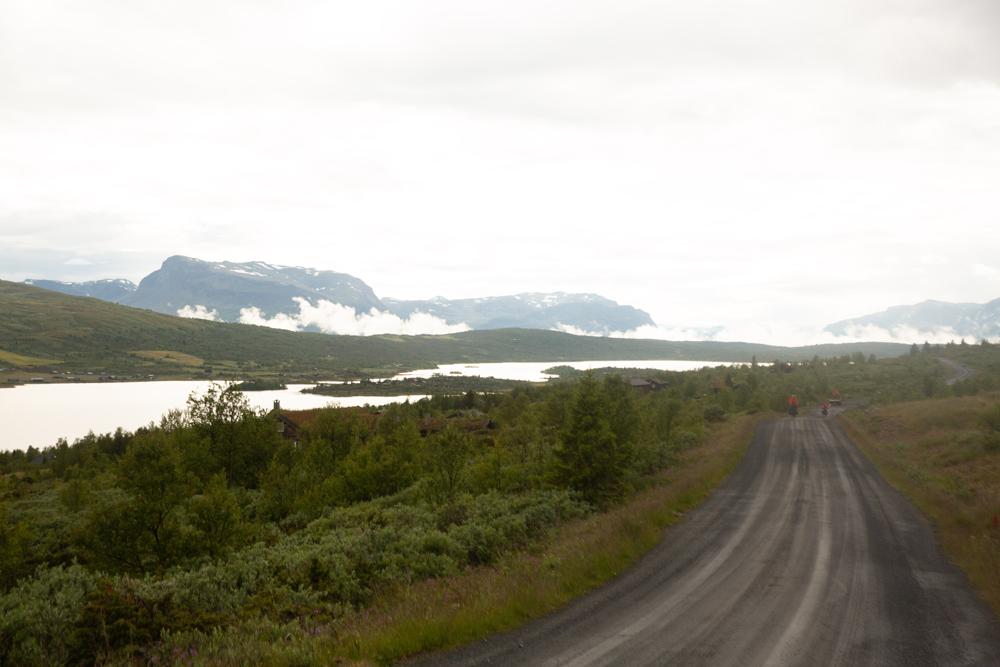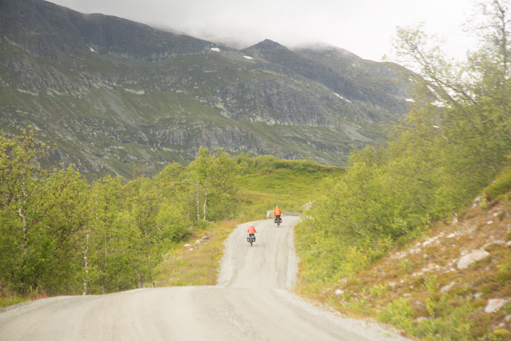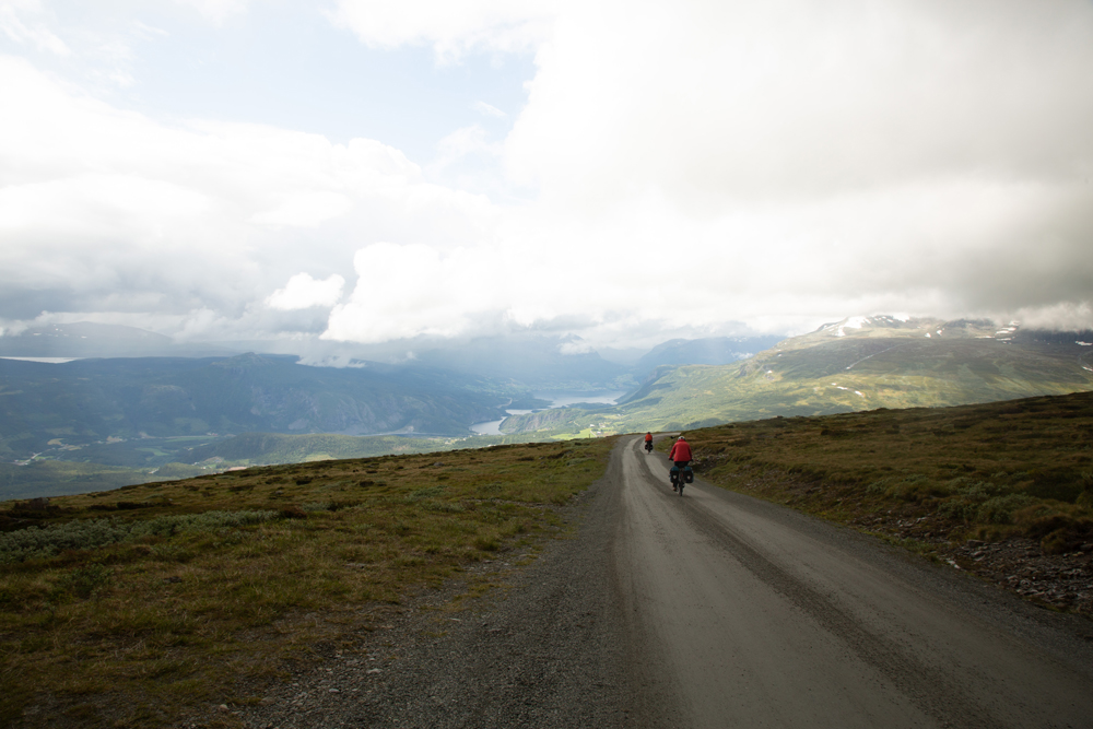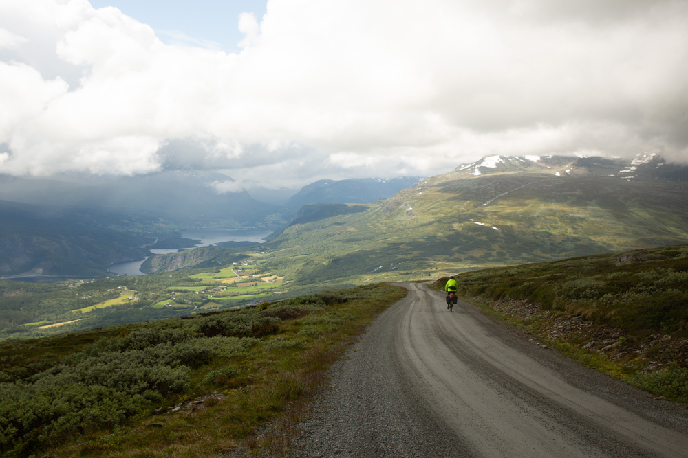 Heading left we were to follow the Mjolkevegan cycle path that is one of the most scenic in Norway, it was a shame though that no-one told the weather gods as the cloud was low. Descending past farmland we arrived at a barriered toll road that rose upwards towards the snow line. On gravel the gradients are often steeper so walking could be faster. Up and up, trying to guess how we were to get out of the valley. A left turn showed the way as a reasonably straight road soured into the distance climbing, look back and high snow covered peaks rose in the distance. ‘You’re smashing it’ chirped a voice, then another as a friendly group of holiday racing cyclists from the USA came past on bikes we could only dream about. At the top Laurinda was fed biscuits from their support van before a glorious vista and rapid descent took us took us to the valley below.