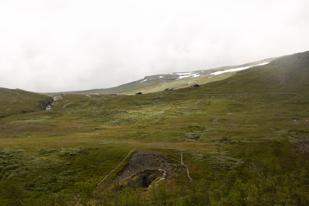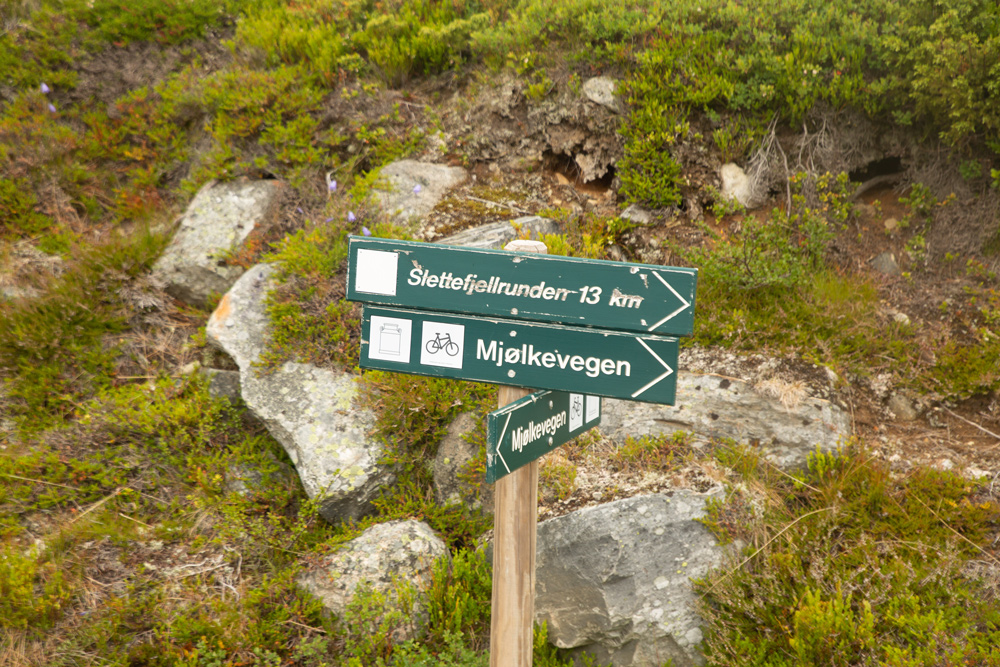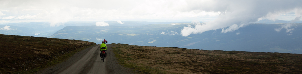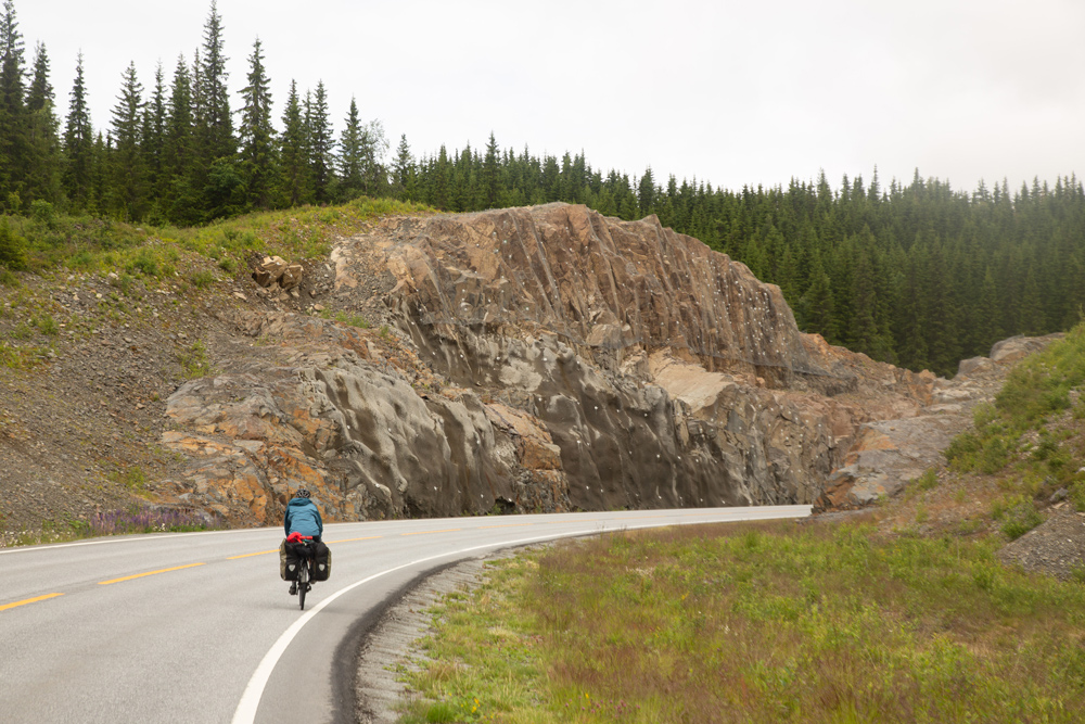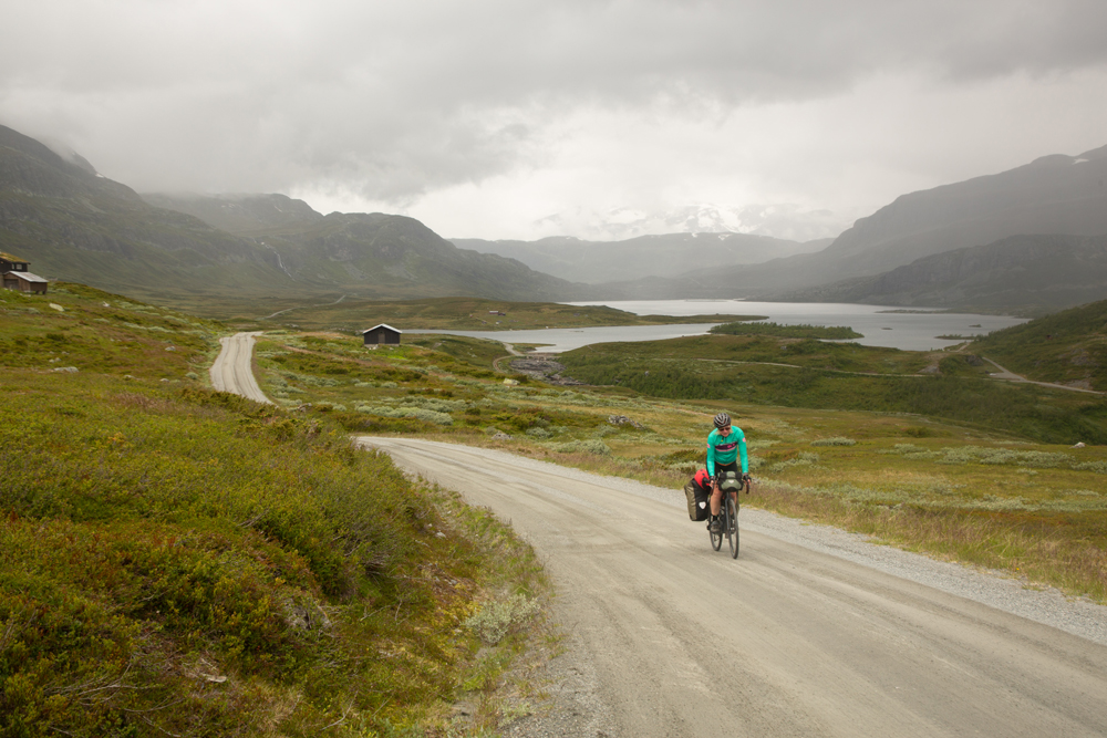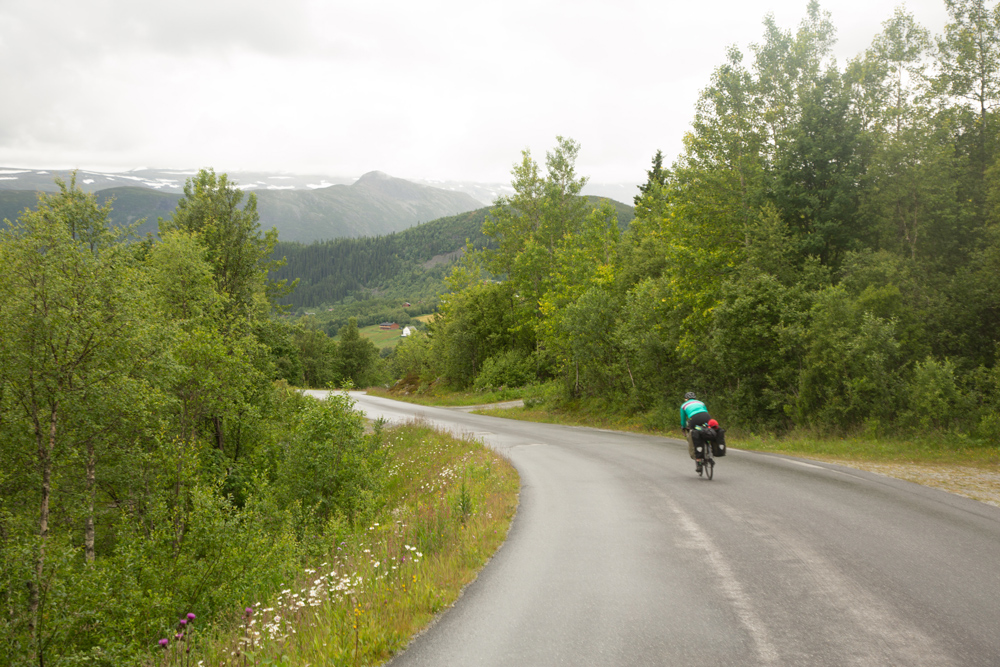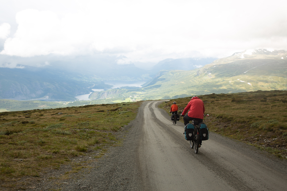 Heading left we were to follow the Mjolkevegan cycle path that is one of the most scenic in Norway, it was a shame though that no-one told the weather gods as the cloud was low. Descending past farmland we arrived at a barriered toll road that rose upwards towards the snow line. On gravel the gradients are often steeper so walking could be faster. Up and up, trying to guess how we were to get out of the valley. A left turn showed the way as a reasonably straight road soured into the distance climbing, look back and high snow covered peaks rose in the distance. ‘You’re smashing it’ chirped a voice, then another as a friendly group of holiday racing cyclists from the USA came past on bikes we could only dream about. At the top Laurinda was fed biscuits from their support van before a glorious vista and rapid descent took us took us to the valley below.