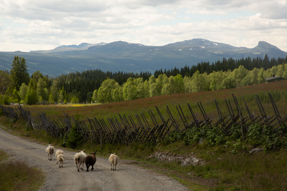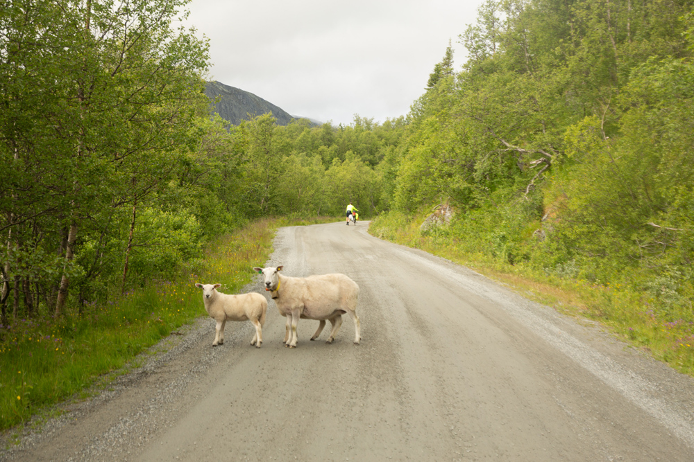 Coffee and buns consumed because Norwegians do an excellent patisserie we were fuelled up for the main course of the day, the climb. Some were armed with flashing back lights as the bike shop had darkly warned that this was hilly and motorists drove fast along this stretch. The aperitif was more of Norways fabulous cycling infrastructure because not even marked on the map was a wide cyclists bridge across Mjosa lake that led to an old road that parallel the E6, a legacy of the road building program. Flat by the lake it headed left before the right turn, uphill and a Dokka 46 sign. With this the bike shop were right, it was the climb that just kept on giving. 7% for 8km as we all hauled our way up in whatever fashion suited. As for the fast cars, they were more concerned with the sheep grazing on the edge and centre of the road.