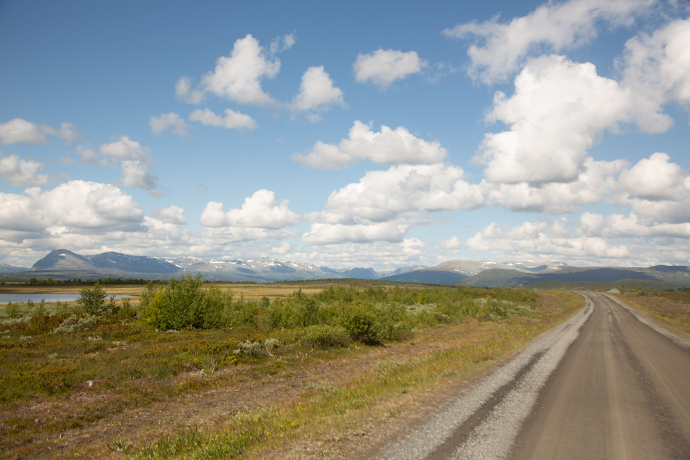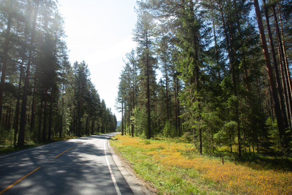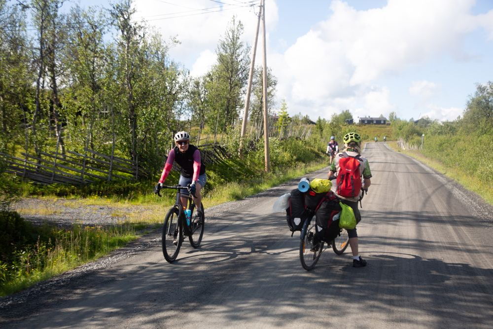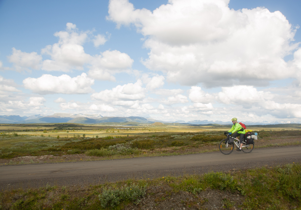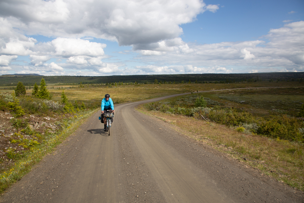 What’s that yellow orb in the sky? We need to worship it. Yes, finally the sun was out as folks frantically tried to dry anything that wasn’t nailed to the trees. Away via the Joker supermarket for the longest and hardest climb of the day on smooth gravel heading for lots of holiday huts that the Norwegians love so much.