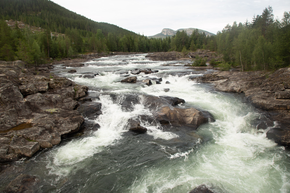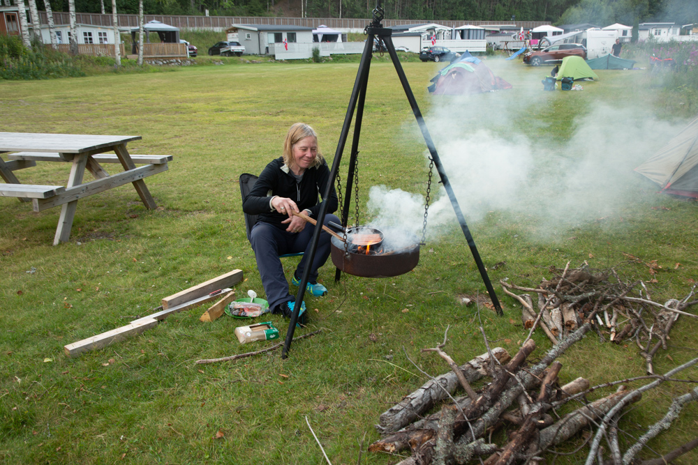 To our left you could see a valley deep below and it was into this for the final long decent on tarmac. Round the edge of Gol and into the campground where we pitched to the sound of road and railway. The river could be swum entertaining a few hardier soles. For dinner we communally cooked sweet and sour vegetables tucked around a picnic table.