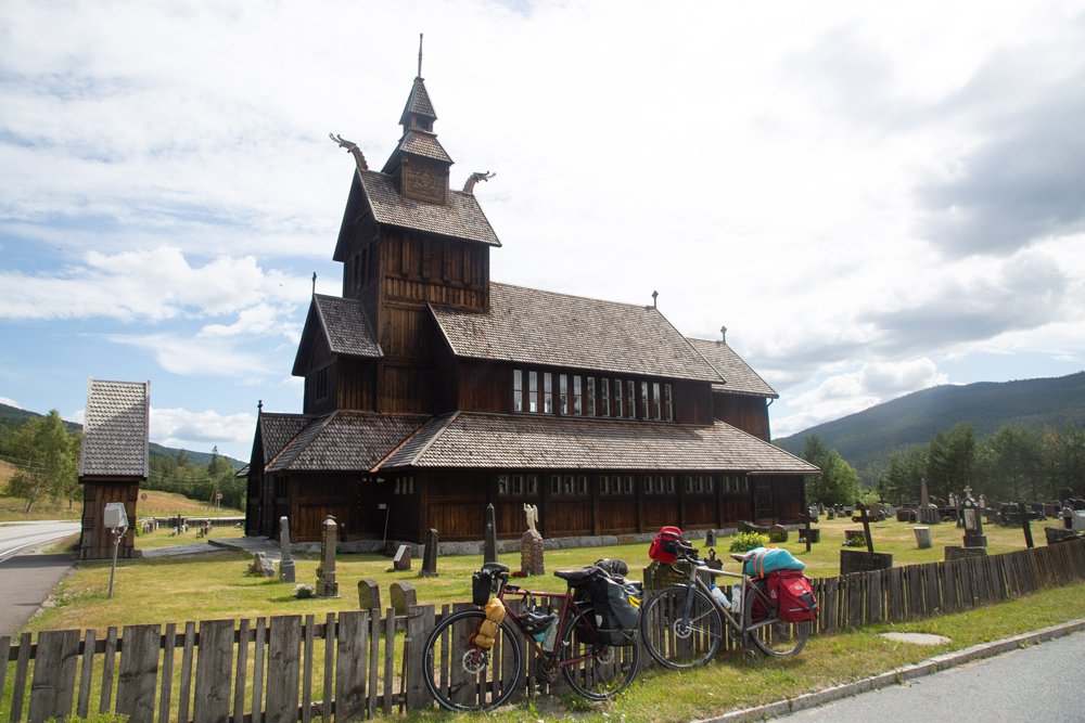 Cabins cleaned and breakfasted it was a 10km tarmac climb along the valley followed by a descent to the E road. Even though it was Sunday there was plenty of camper vans and cars on the road. We started with a long climb and then a descent to Aurdal where the pretty white church stood by the Fjord. The Bakeriet by the main road had the most amazing cinnamon buns and an even better cyclepath that took us all the way to Leira and then Fagernes.