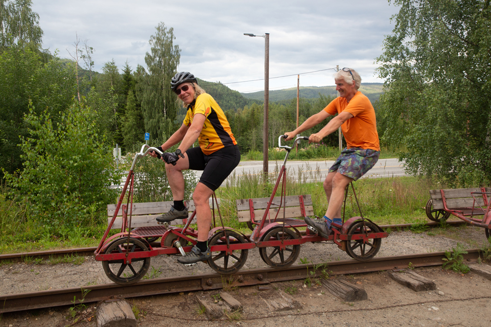 At Veggli we got off, thanked the driver profusely and reloaded the bikes, but what’s this? From another stave church near Rustberg to here you could pedal carts along the disused railway, one that we would follow the next day, so we had a go as after all why not.