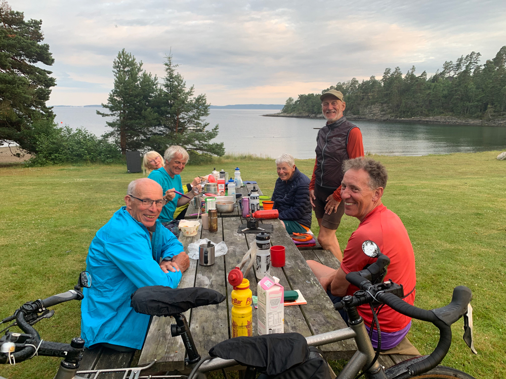 We ended with the 2km road to Knatvoldstranda camping where we were greeted with enthusiasm by the manger who was expecting the cycle tourists. Flat, grassy, right by the sea, picnic tables, what more could you wish for. In the sunshine some of us took a dip in the sea that was crystal clear. Underneath your feet small fish swam and crabs scuttled about, yes it almost felt like a holiday.