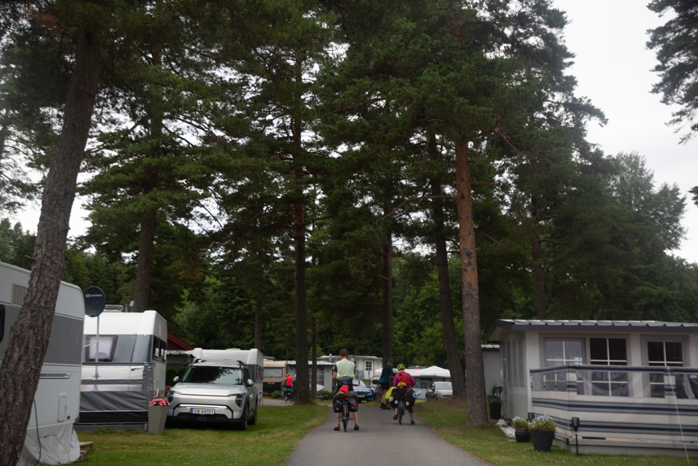 The climb out of Kongsberg was a touch brutal. We were now on route 4, a new cycle route as it wound round the housing estates to finish on a frankly un Norwegian road that roller coaster end and twisted through the trees. A descent to a lake and yet another cycle path before a last climb up and over a zig zag climb led to a Hoksund and a huge campsite. It was hot, very hot, it was Friday night and this was close to Oslo, so space was at a premium ending up in the centre of a field surrounded by camper vans, however the facilities were excellent and the best kitchen yet.